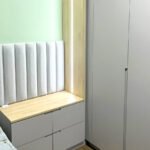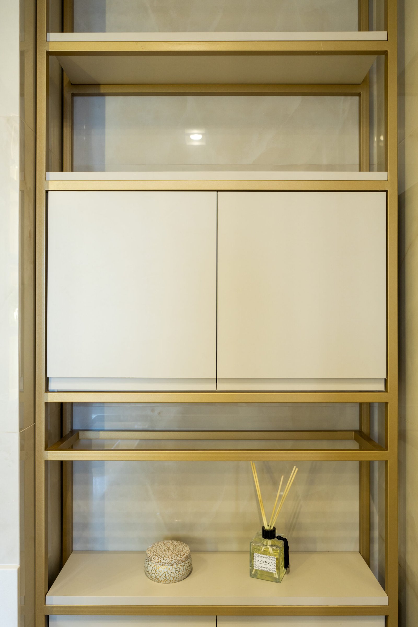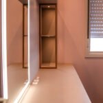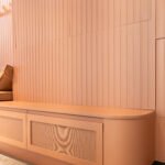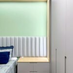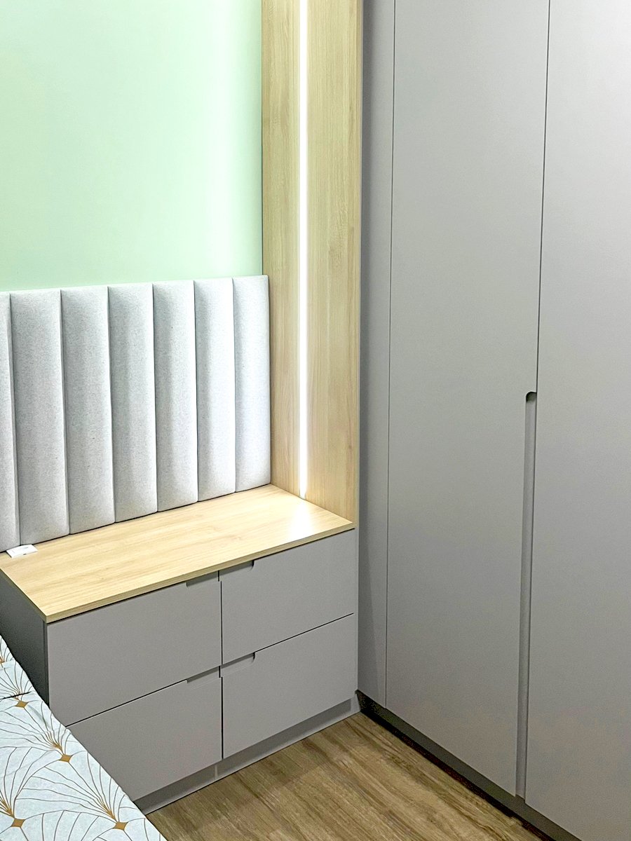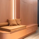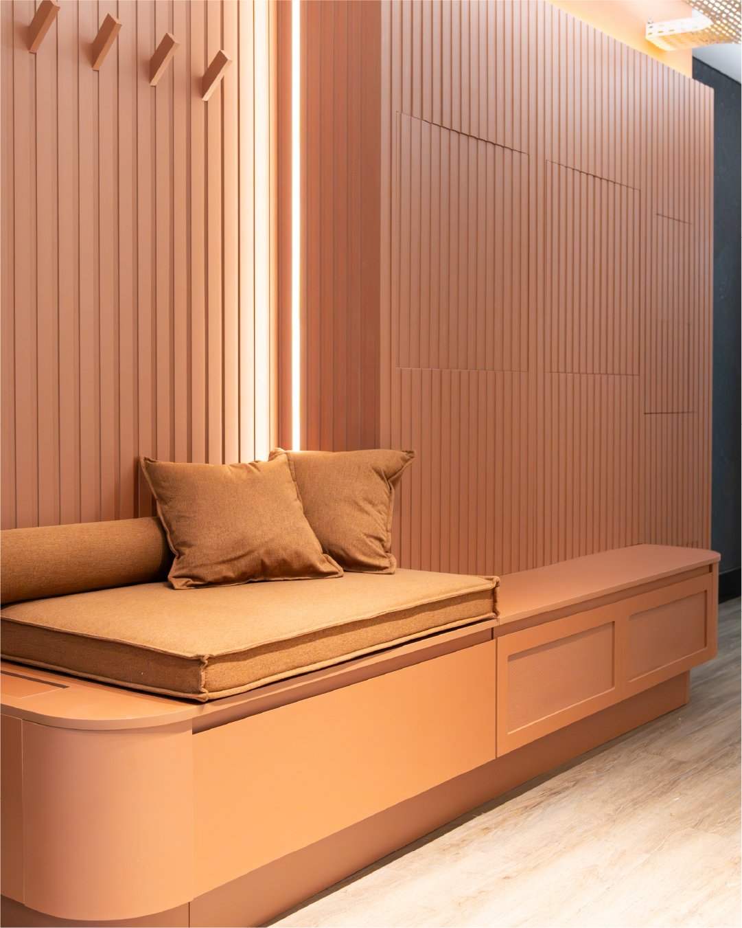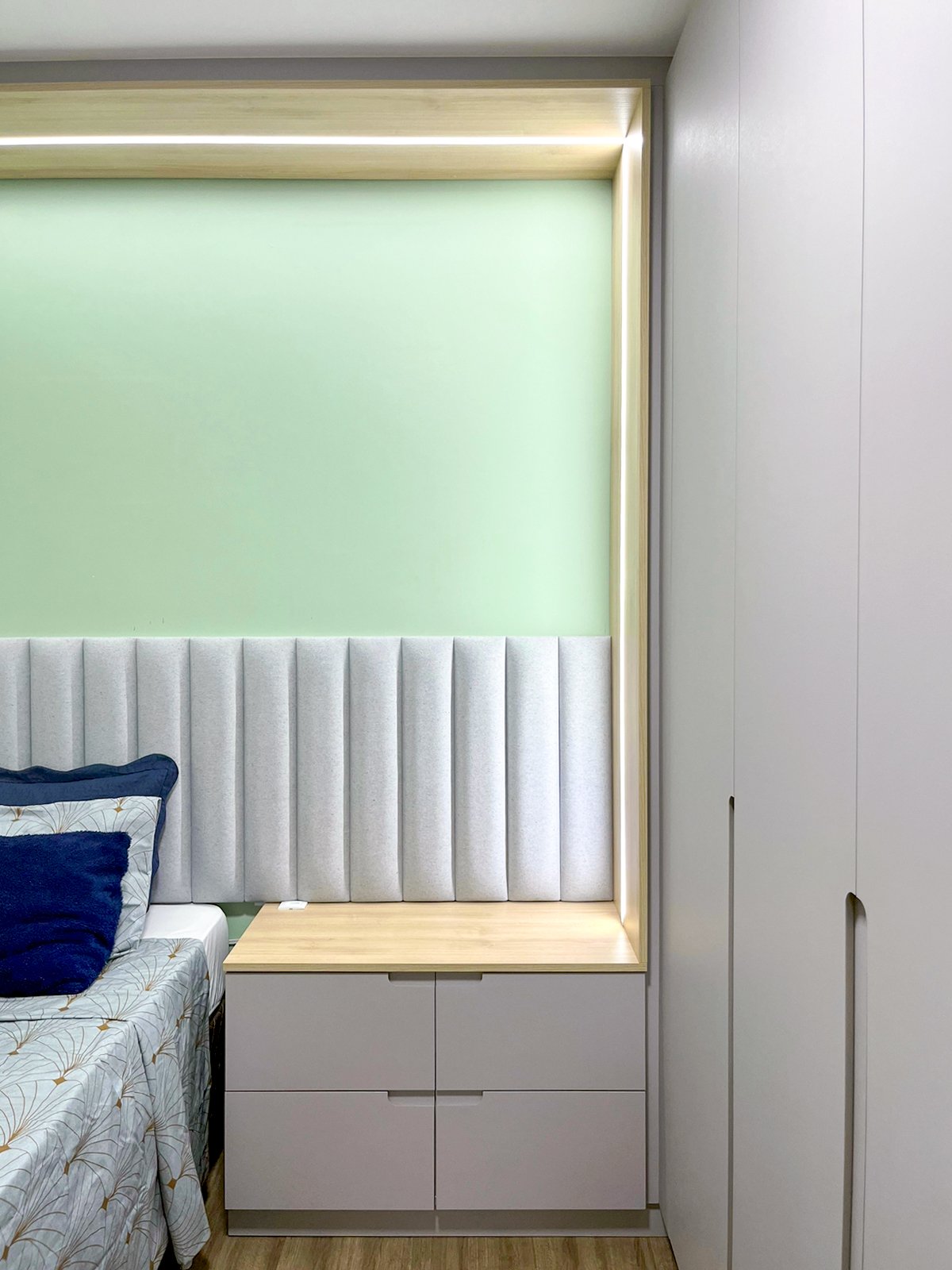 O estofado embutido e a iluminação discreta completam o ambiente, unindo conforto e sofisticação em um espaço