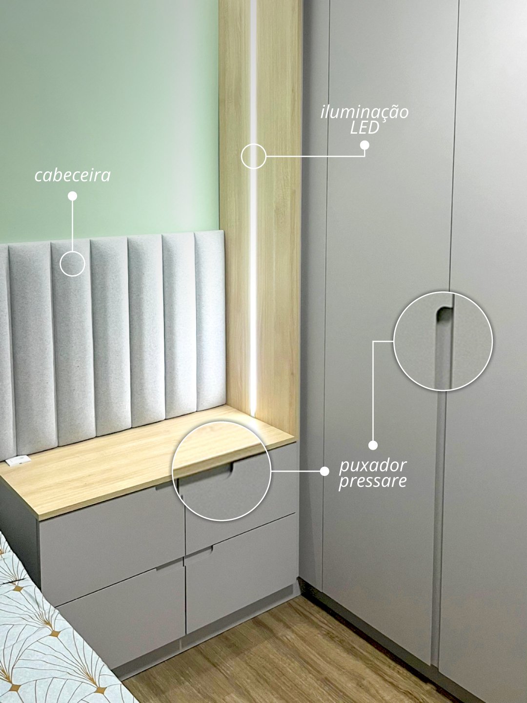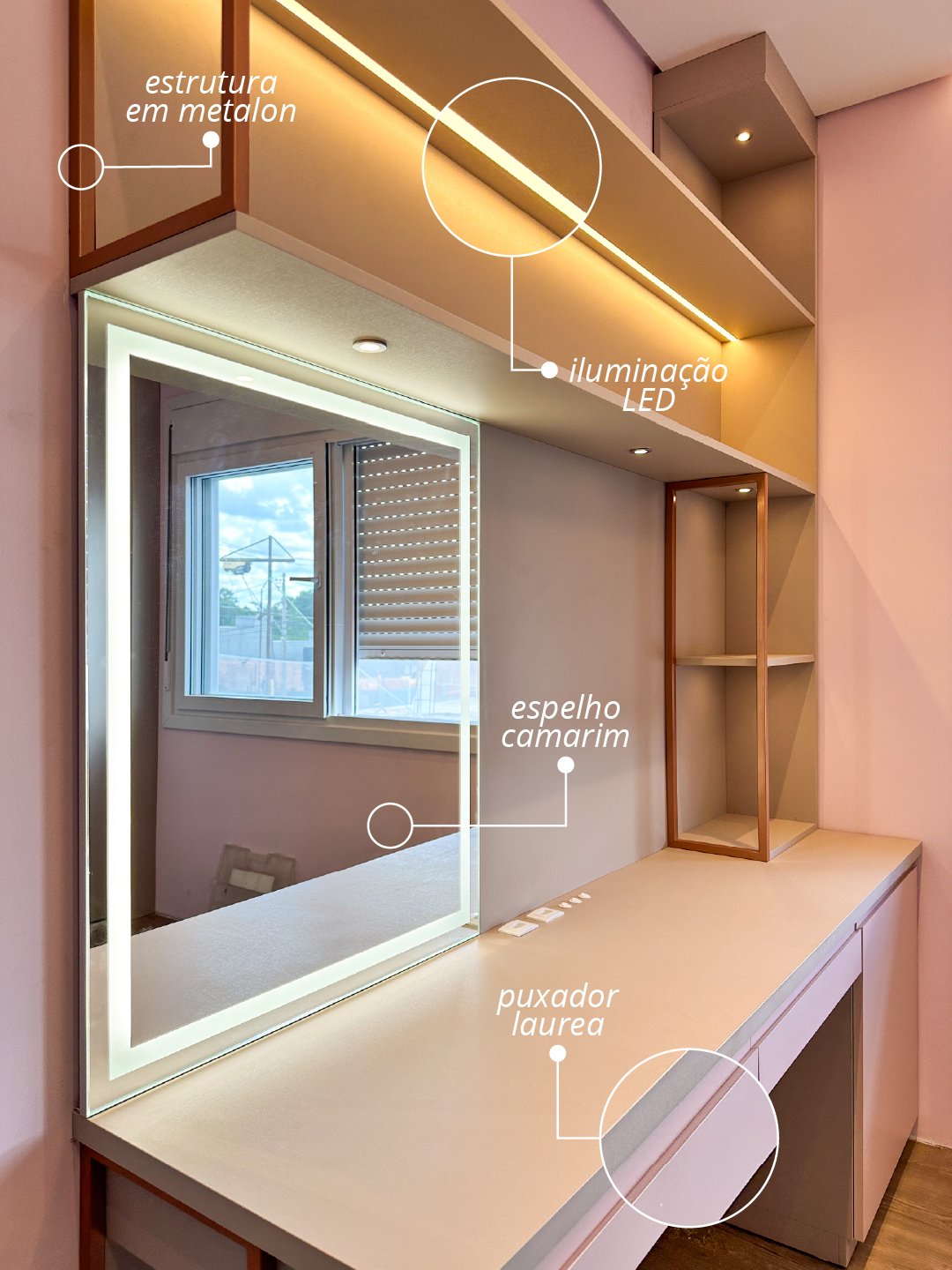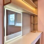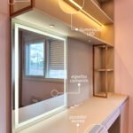 O destaque fica para a penteadeira com espelho retroiluminado, que alia funcionalidade e elegância ao espaço íntimo.
